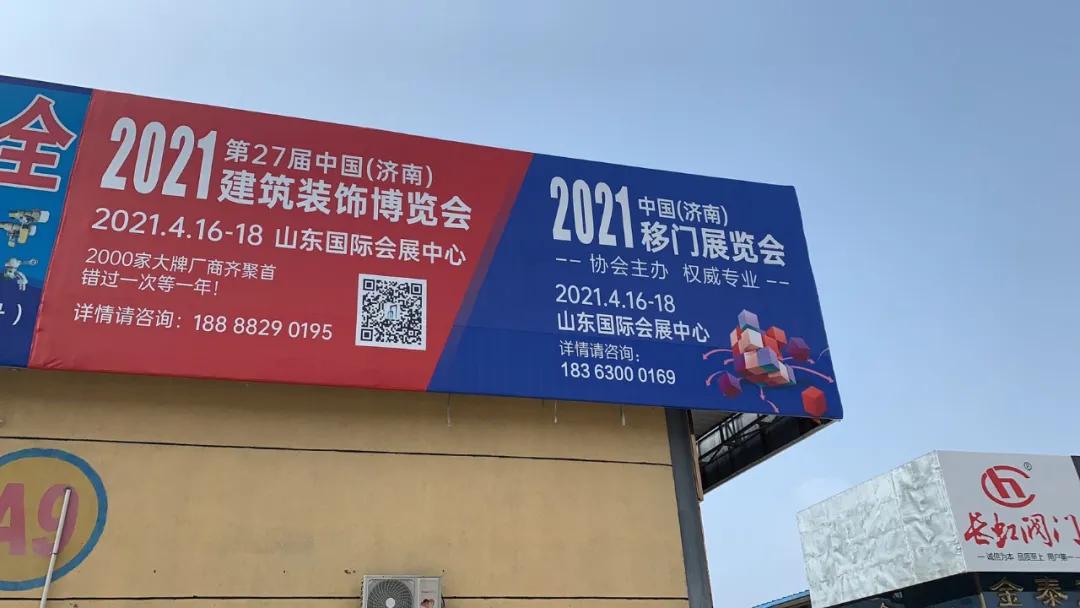 2021年第27屆中國(濟南)建筑裝飾博覽會將于2021年4月16-18日在山東國際會展中心盛大召開!為了全面提高展會的宣傳力度,保證展會質量及展商效果,組委會聯系線下建材市場,發布展會日期,力爭將展會開幕信息傳達給更多的業內人士。目前山東多地市建材市場已豎立展會廣告牌信息,您看到了嗎?